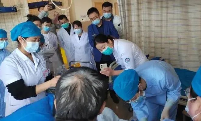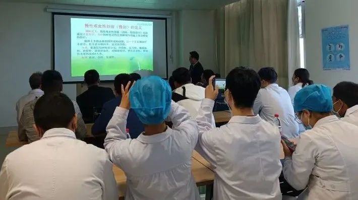 創(chuàng)面治療師進(jìn)行現(xiàn)場(chǎng)觀摩換藥實(shí)操,老師們一邊觀看,一邊咨詢(xún),徐文舉主任用心講解。