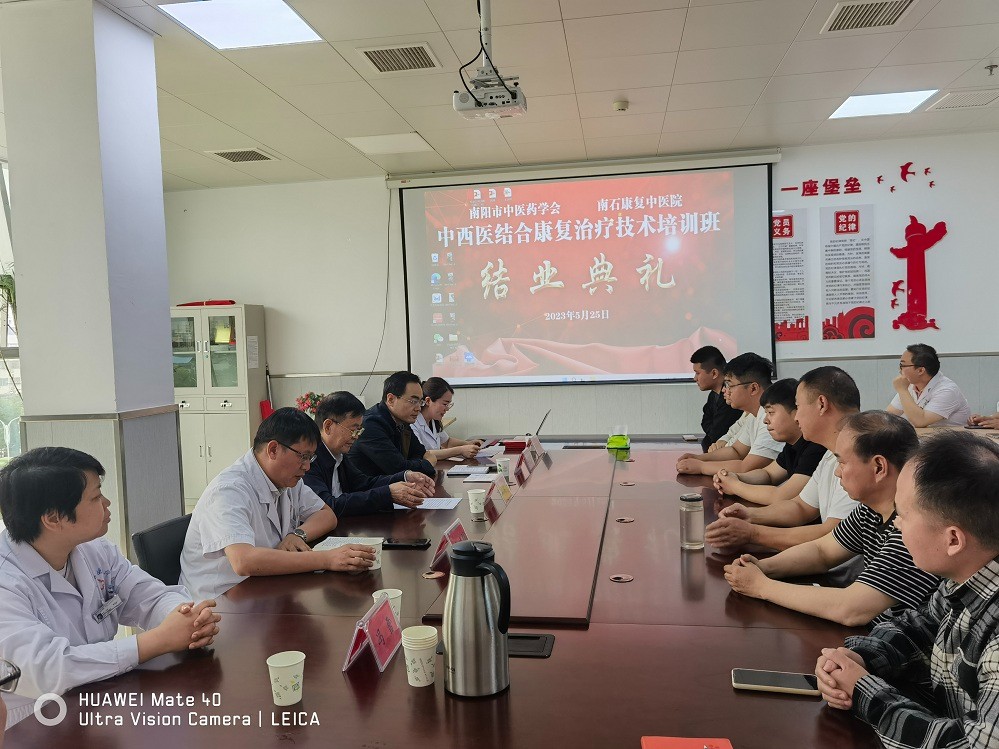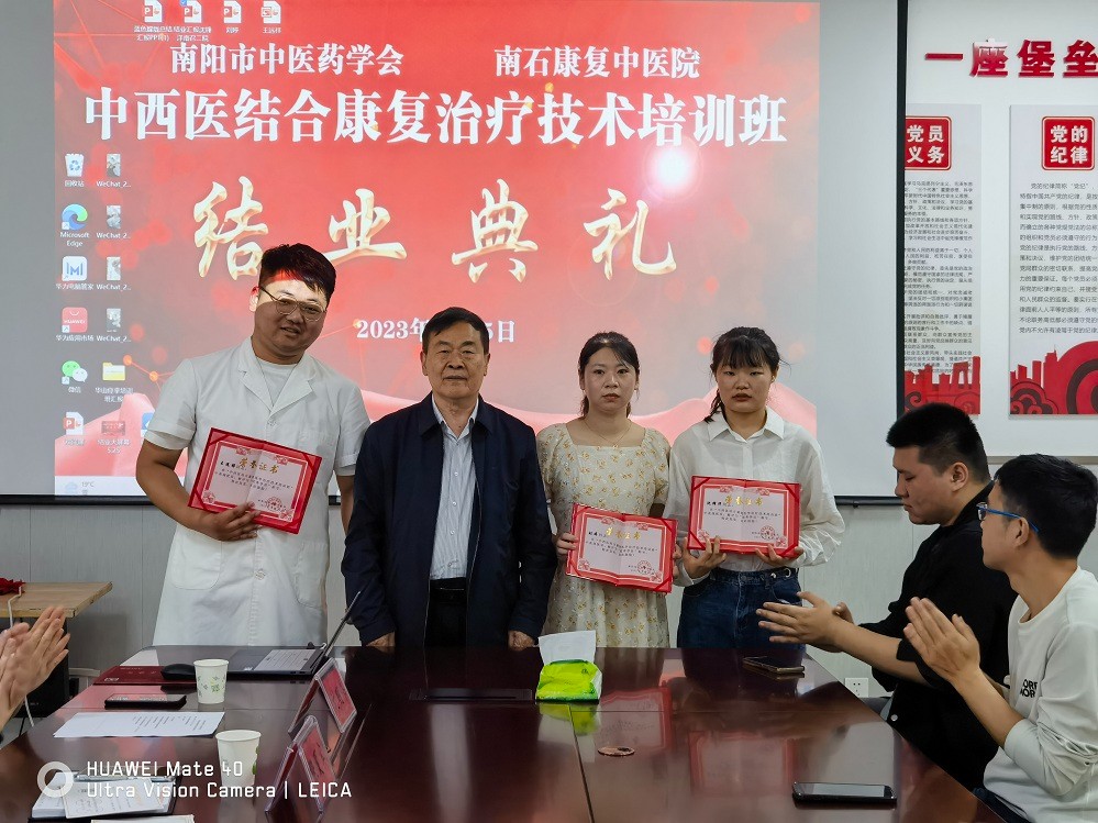 南石康復(fù)中醫(yī)院副院長劉明偉主持結(jié)業(yè)典禮,南陽市中醫(yī)藥學(xué)會(huì)張夏賓科長,南石醫(yī)院黨委委員、副院長石軍峰,南石康復(fù)中醫(yī)院院長王建暉在結(jié)業(yè)典禮上講話??祻?fù)中醫(yī)院部分教學(xué)老師及培訓(xùn)學(xué)員參加結(jié)業(yè)典禮。